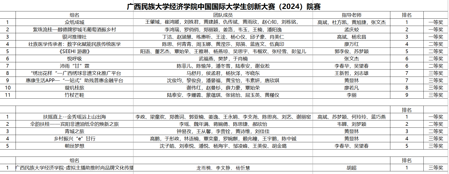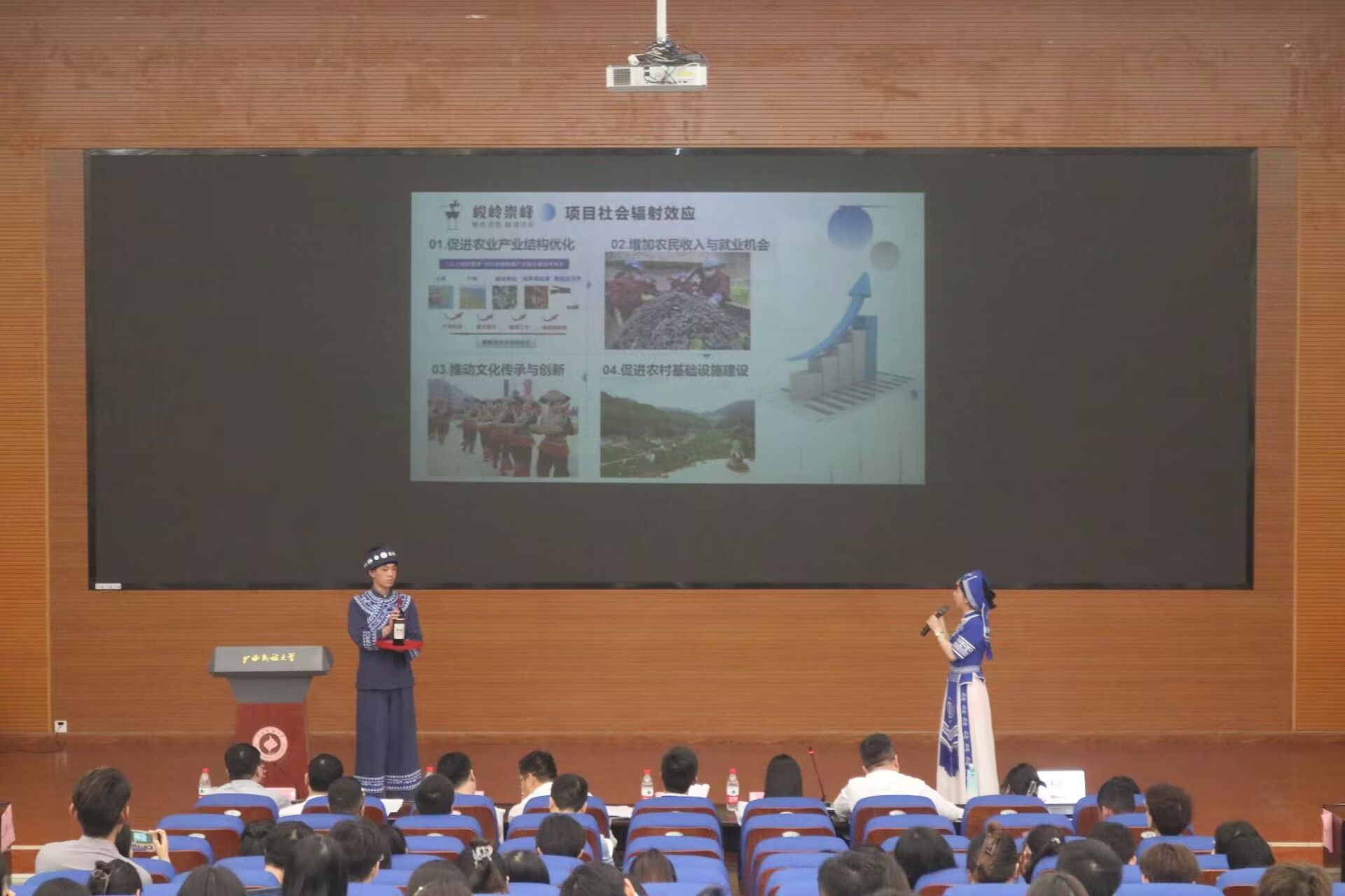 本次比赛分为路演演讲和评审答辩两个环节。经过激烈角逐,最终“竹杖芒鞋”、“璇玑桂旅”、“绣出花样——广西绣球非遗文化推广平台”等七个项目获得三等奖,“壮族医学传承者:数字化赋能传统医学”、“悦呼吸”等六个项目获得二等奖,“众纸成城”、“紫珠流桂-醇德牌罗城毛葡萄酒振乡村”、“银河推理社”、“扶摇直上--金秀瑶浴上出出海”四个项目获得一等奖。