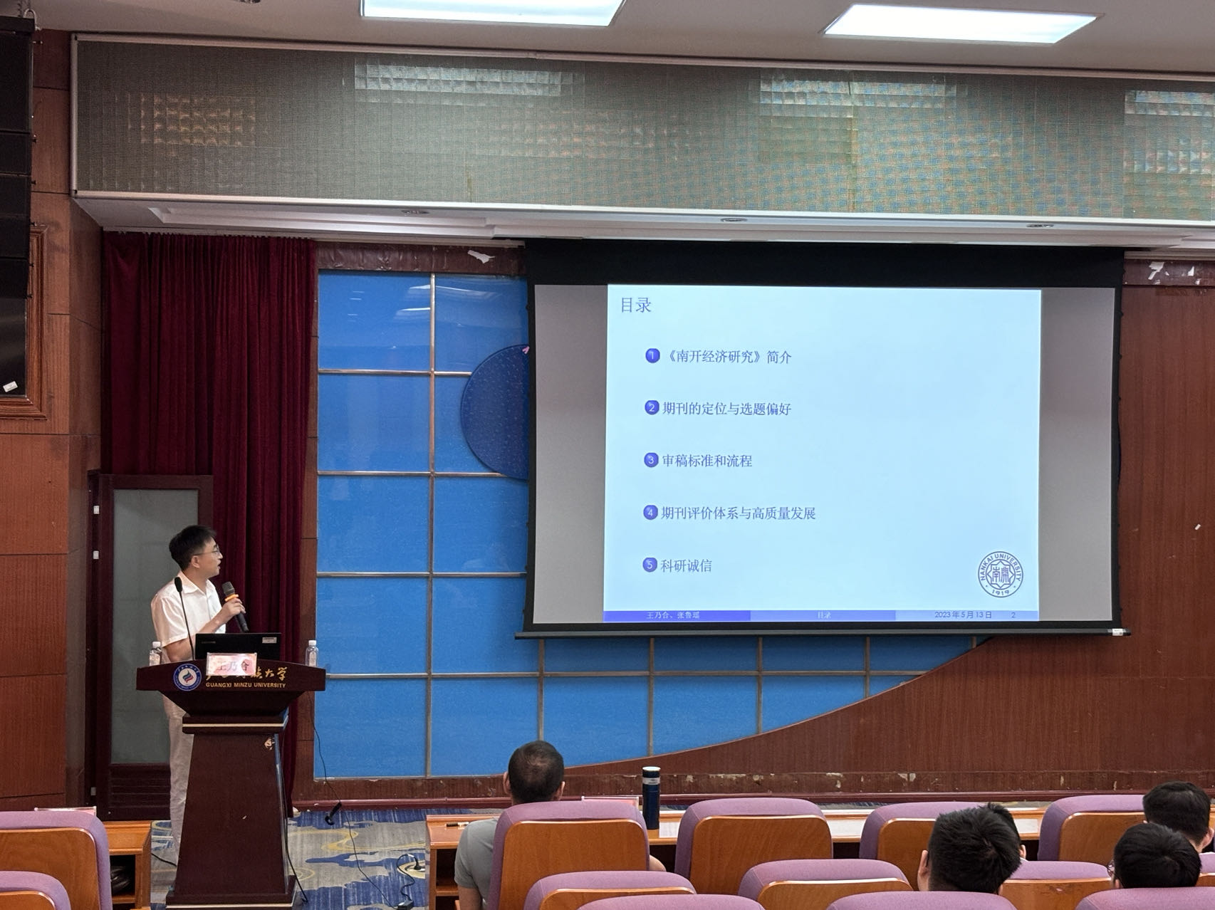 讲座中,王乃合研究员通过对《南开经济研究》期刊进行简介,向同学们介绍了期刊的审稿标准与流程、期刊评价体系、期刊定位与选题偏好等核心问题。其中,王乃合研究员重点向同学们讲解了期刊评价体系所需具备的“引领力、创新力、影响力、管理力”等因素。