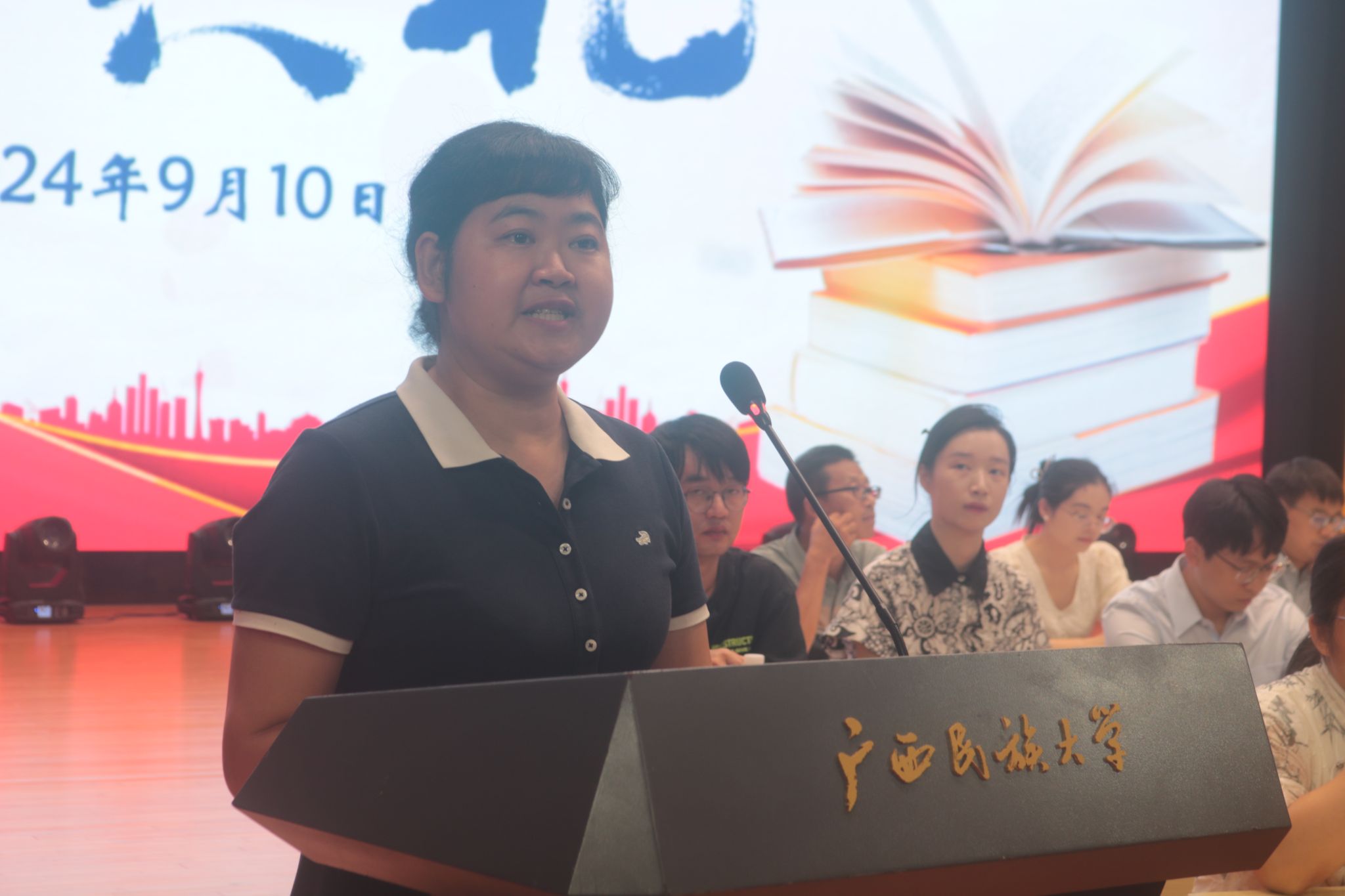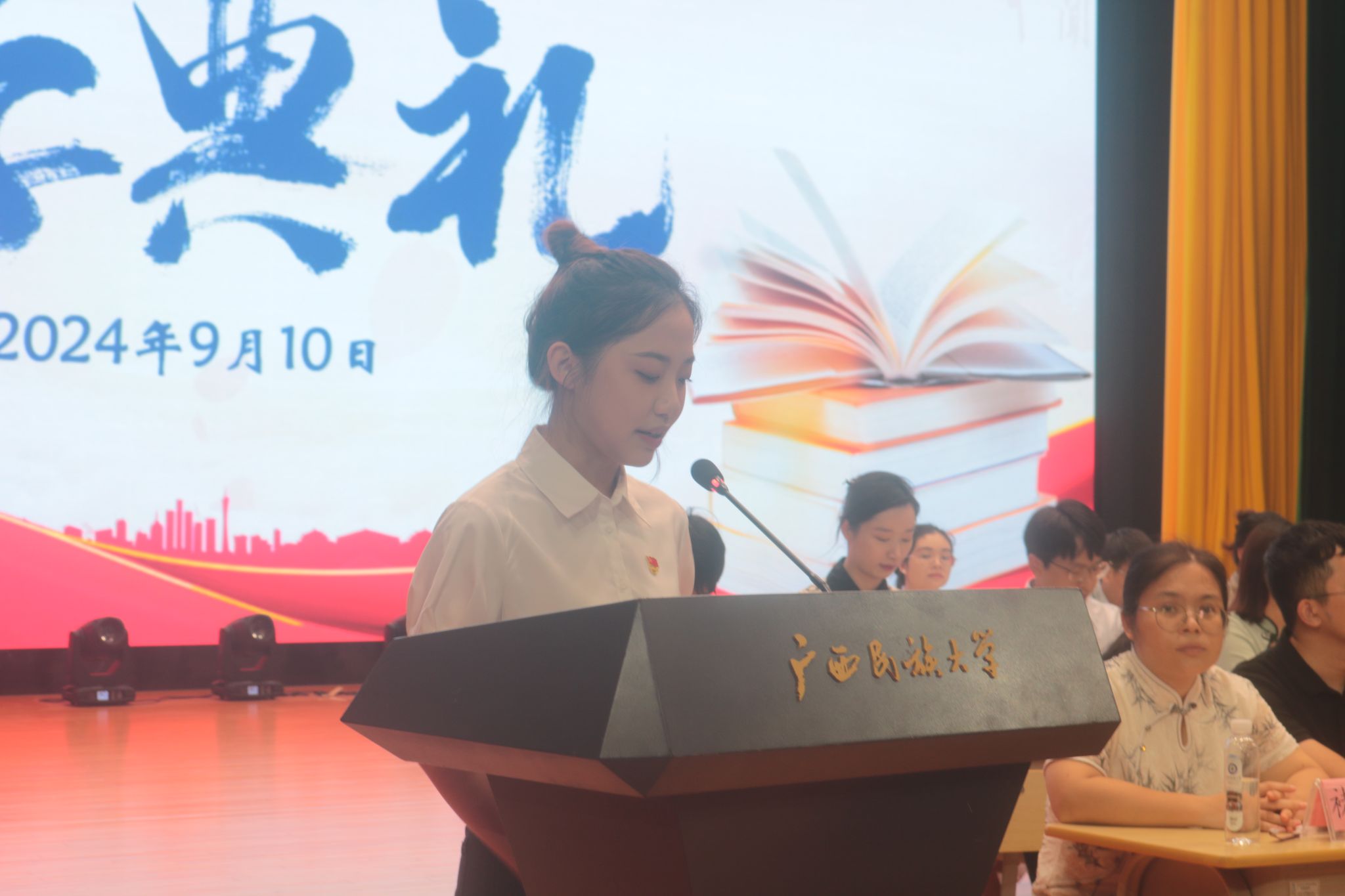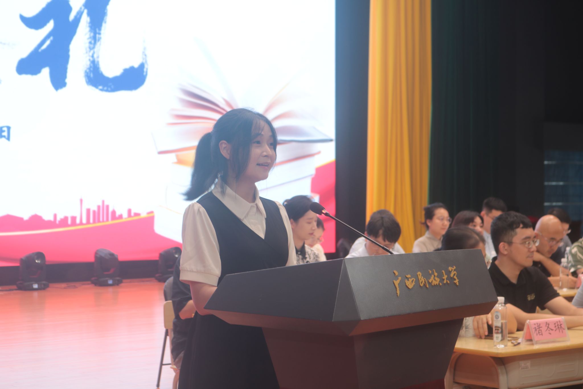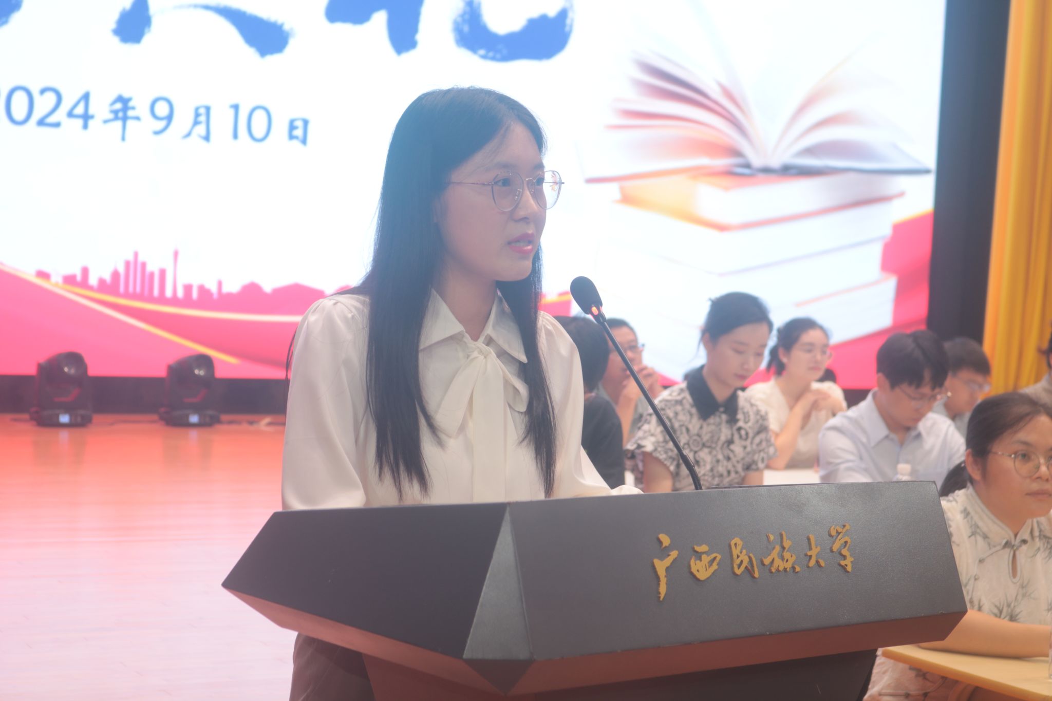 在发言环节中,教师代表陈敏娟、潘昱,辅导员代表黎靖、本科新生代表2024级国际经济与贸易2班甘艳玲、研究生新生代表2024级金融学专业陈蕾竹、本科老生代表2021级国际经济与贸易2班范家文、研究生老生代表2022级国商国际商务1班胡弟海纷纷上台,分享了各自的心路历程与感悟。他们从不同角度阐述了大学生的理想状态:志存高远,积极生活。大学是全新起点,唯有不懈奋斗,方能铸就精彩篇章。