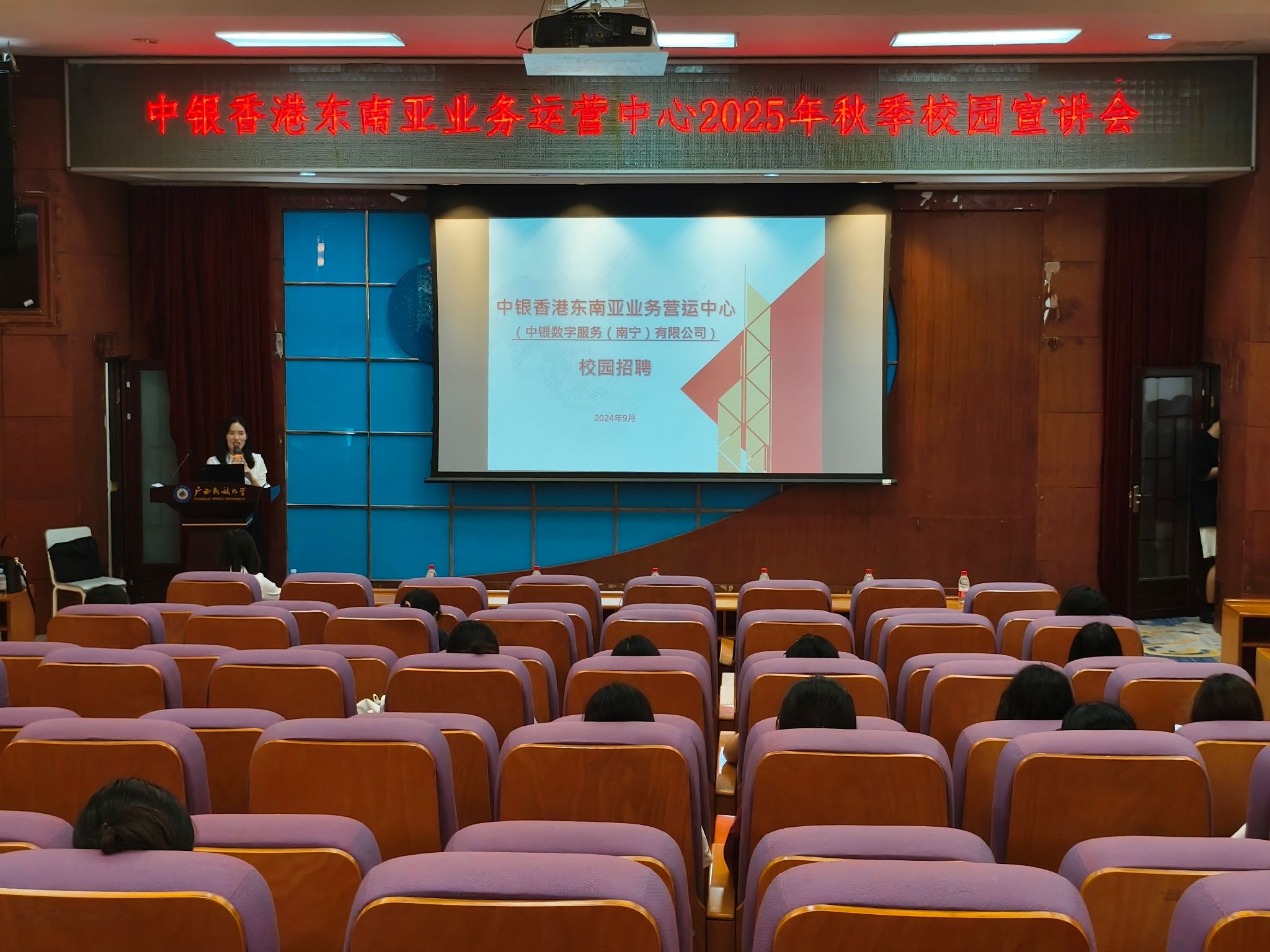 9月20日,365英国上市官网于至善楼报告厅顺利举办中银香港东南亚业务运营中心2025年秋季校园宣讲会。会议由中银数字(南宁)有限公司工作人员主讲,2021级部分学生参会。