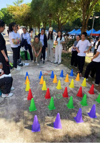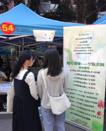 “蓝天保卫队”在广西民族大学思源湖田径场周边的摊位上设立了专门的回收点,积极倡导师生将用过的塑料瓶带至摊位进行回收,并参与其中的套圈游戏。游戏中,参与者有机会通过套圈赢取绣球、竹编篮、龟苓膏等多种奖品。团队巧妙地将环保行动与壮族文化特色相结合,创新性地推广了壮族文化的传播方式,同时激励更多人投身于环保事业,深入认识壮族的独特文化。